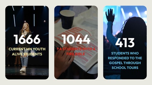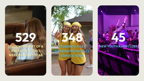 In the last four years, our team has seen more than 2400 students receive training on how to share Jesus. 1,077 students have received a “Youth Alive FireBible “to use for campus clubs, sharing their faith and the study of God’s Word. This has resulted in 394 MN schools having a student leader/missionary and/or a club at school. Kelli Patrick has led the way with student engagement.